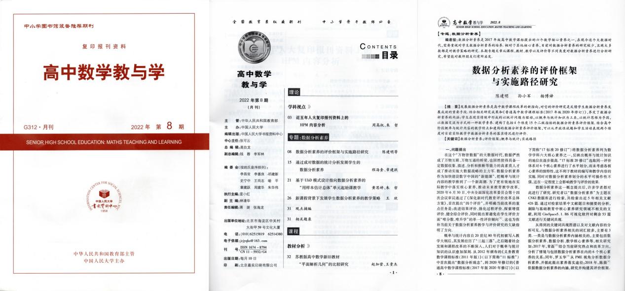 近日,公司best365孙小军教授研究团队完成的研究论文《数据分析素养的评价框架与实施路径研究》一文被中国人民大学复印报刊资料《高中数学教与学》2022年第8期全文转载,原文发表于《数学教育学报》(CSSCI来源期刊、全国中文核心期刊)2022年第2期。公司为该论文的独立完成单位及通讯单位,公司best3652019级学科教学(数学)研究生陈建明为第一作者,孙小军教授为通讯作者。