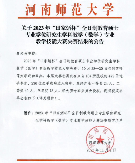 11月2日,2023年“田家炳杯”全日制教育硕士专业学位研究生学科教学(数学)专业教学技能大赛决赛结果在河南师范大学网站公告,公司教育硕士专业学科教学(数学)研究生潘佳怡、任旭东获得三等奖。此次比赛共有来自全国104所院校的472位选手参加,236位选手进入决赛。best365研究生初次参加“田家炳杯”教学技能大赛,四名研究生进入决赛,从初赛到决赛历时五个月,经过选手们精心准备、反复研磨、交流探索、模拟训练,最终两名获得三等奖、两名获得优秀教学设计奖。