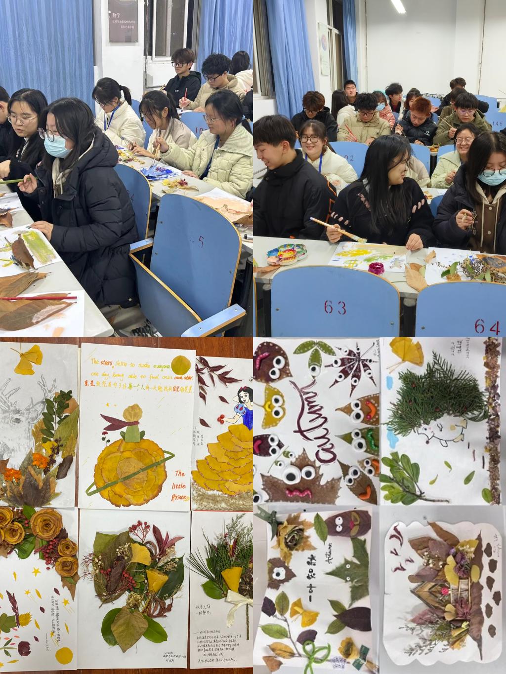 活动中,同学们巧妙构思,潜心制作,让花草枝叶等自然之物在纸页纷飞,或用画笔勾勒线条,或利用颜料渲染色彩,通过自己灵巧的双手将秋天的痕迹粘贴成一幅幅精致的画卷,有栩栩如生的植物、有惟妙惟肖的动物、也有美不胜收的景物,充分展示了秋天的神韵。活动现场欢声笑语,同学们互帮互助,氛围十分欢乐。