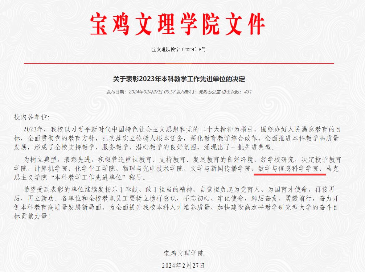 近日,公司公布了《关于表彰2023年本科教学工作先进单位的决定》,公司荣获“本科教学工作先进单位”称号。这是学院自2022年以来连续两年获此殊荣。