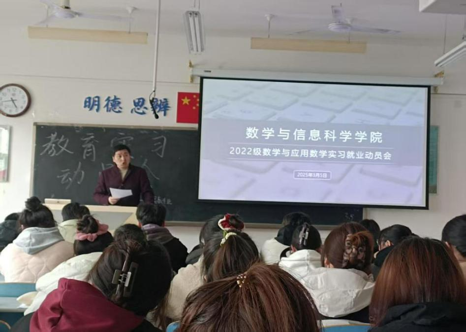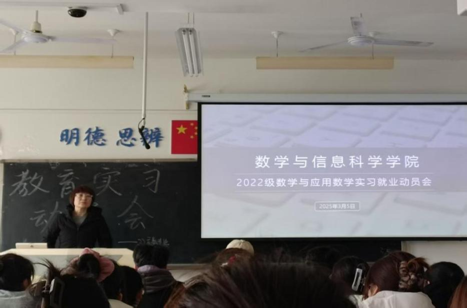 2025年3月5日,best365于思贤楼426教室召开2025年教育实习动员大会。数信公司党委副书记王欢、副经理杜红珍、辅导员张景瑞,实习带队教师安海龙以及2022级数学与应用数学专业全体员工齐聚一堂,共同开启教育实习的重要篇章。