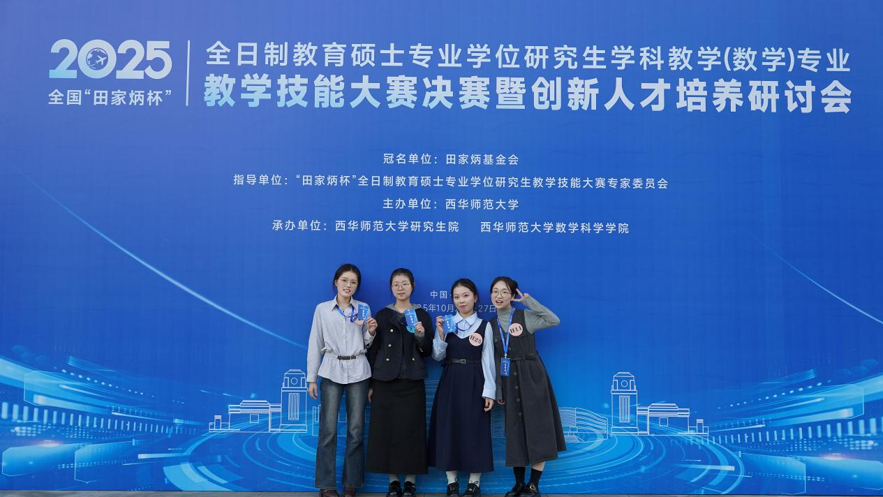 近日,2025年全国“田家炳杯”全日制教育硕士专业学位研究生学科教学(数学)专业教学技能大赛决赛在四川南充举行。公司2024级学科教学(数学)专业硕士研究生梁奕晨同学获得国家二等奖,王思雨、徐春蕊和张晨钰三位同学获优秀教学设计奖。