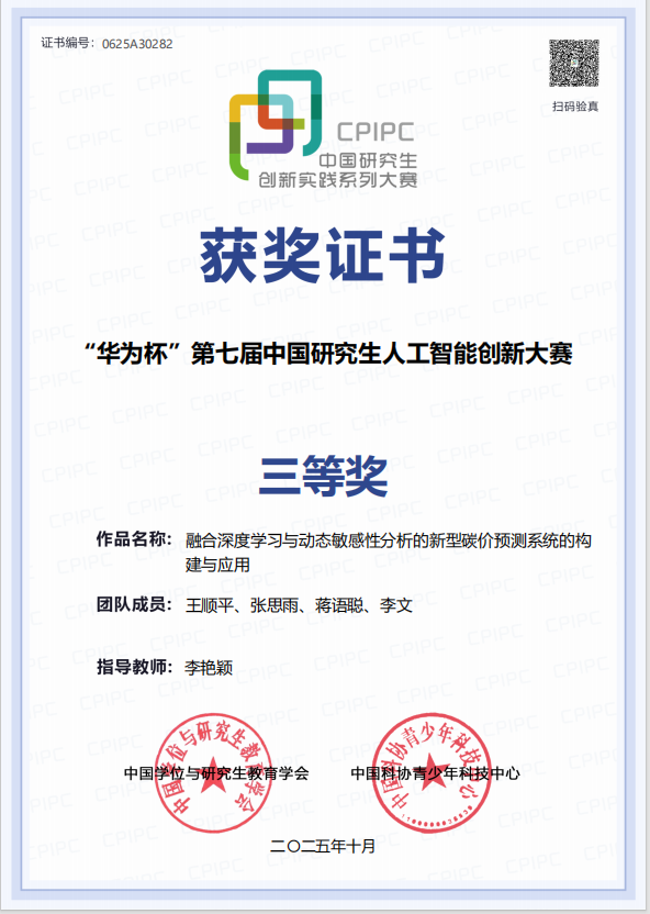 近日,“华为杯”第七届中国研究生人工智能创新大赛全国总决赛在山东青岛举行。公司参赛作品《融合深度学习与动态敏感性分析的新型碳价预测系统的构建与应用》获三等奖,实现了公司在中国研究生创新实践系列大赛中国家级奖项的历史性突破。