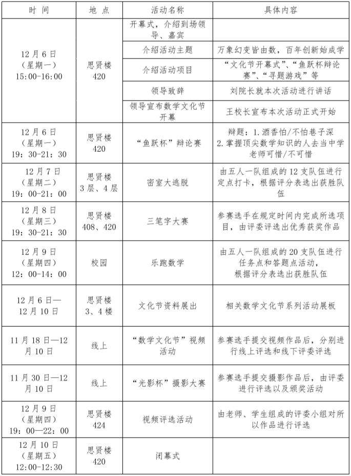 为大力弘扬数学文化,积极响应国家“大众创业,万众创新”的号召,进一步提升公司老员工的数学素养、创新意识和实践能力,在成功举办了三届数学文化节并取得丰硕成果的基础上,best365认真贯彻落实公司关于“加强学科内涵建设”和“创新创业”的文件精神,以“数学文化”和“创新创业教育”为抓手,拟定于2021年12月6日至12月10日在高新校区举办best365官方网站第四届数学文化节暨创新创业系列活动,以期通过本次活动在公司营造出良好的数学学习氛围,并展示best365近几年专业建设的部分特色成果,进一步推动公司人才培养工作的高效和持续发展。本次活动以“万象幻变皆由数,百年创新始成学”为主题,主要分为11个板块,分别为“文化节开幕式”、“鱼跃杯辩论赛”、“寻题游戏”、“数字涂鸦”、“密室大逃脱”、“三笔字大赛”、“乐跑数学”、“文化节资料展出”、“视频活动”、“摄影大赛”、“文化节闭幕式”。